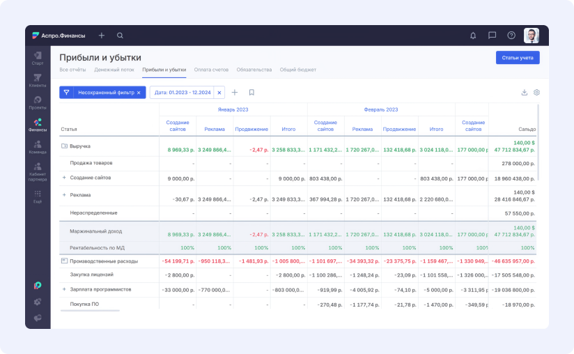 Например, в Аспро.Финансы отчет о прибыли и убытках удобно разбит по направлениям: у каждого направления свой столбец, и сразу видно, как статьи учета связаны именно с ним.