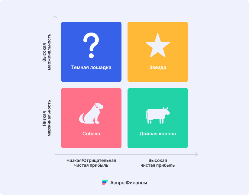 • Дойная Корова: дает стабильный денежный поток, но не имеет высокого потенциала роста. Низкая маржинальность — признак высокой конкуренции или устаревшей модели.